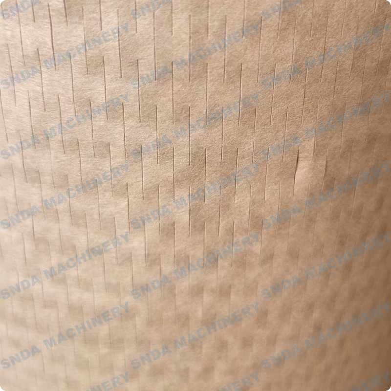 • An environmentally friendly cushioning packing paper or honeycomb packing paper or netted kraft paper, the packing paper or packing paper or kraft paper is provided with a number of longitudinal tear lines and/or cut marks in our Honeycomb wrapping paper die cutting machine module, longitudinal tear lines and/or cut marks matrix Distributed, and the two adjacent rows of longitudinal tear lines and/or cuts are misaligned; stretched along the transverse ends of the packaging paper, the longitudinal tear lines and/or cuts are torn apart, and two adjacent tears The packaging paper between the cracks and/or cuts is distorted under stretching to form a corrugated or honeycomb or grid or network structure.
